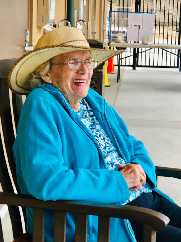 On hotter days, Agnes prefers to utilize the inclusive fitness center (IFC) where it is cooler and out of the sun. In the IFC, Agnes steps over obstacles, practices balance on a foam pad, and performs sit to stand exercises to make sure she is prepared for any obstacles she may encounter when out walking in the community. She also participates in upper extremity strengthening, breathing exercises, and postural exercises.