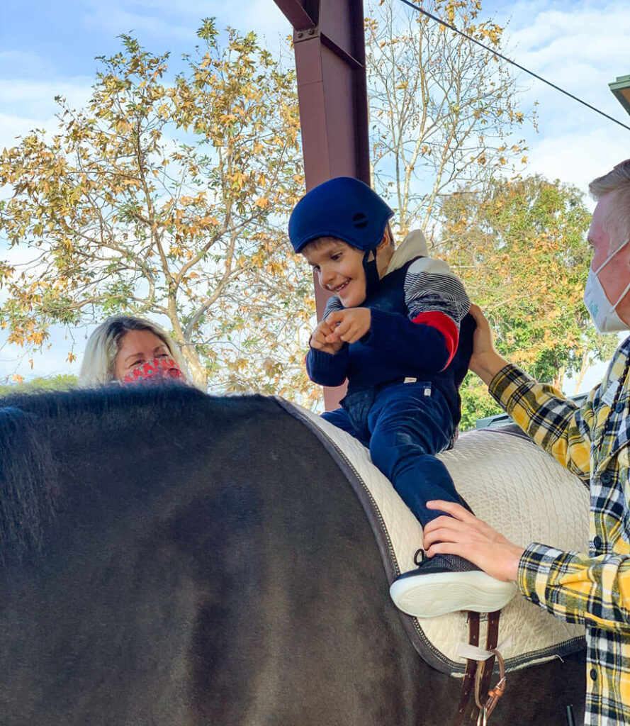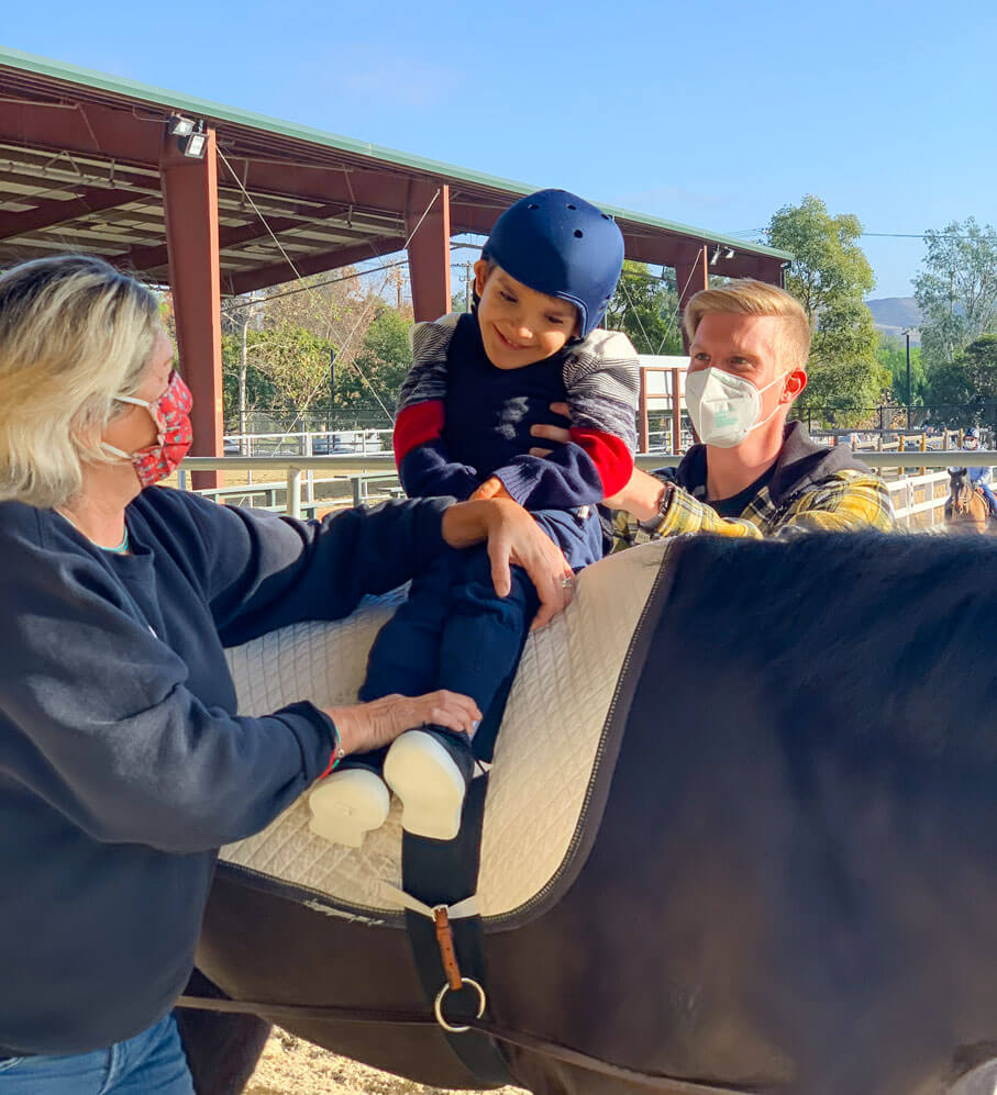 Alessandro’s physical therapist, Matt Mitchell, explains Alessandro’s therapy, “Alessandro benefits from a collaborative approach using physical and occupational therapies. PT focuses on balance and posture, while OT focuses on engagement and sensory integration. Alessandro has grown in his ability to lift his head and look at the other horses in the arena. He now reaches forward while the horse is moving and he loves to play with tactile toys. Alessandro always beams a huge smile when he is sitting sideways and the horse starts walking and changes its movement pattern.”