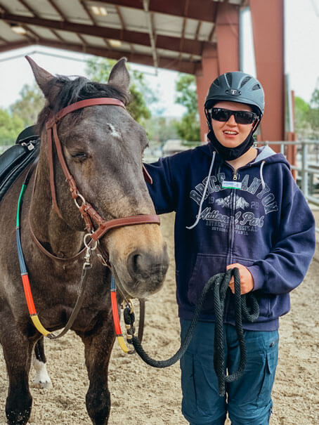 Brenden currently rides Shaw, but one of his favorite horses is Champ. Brenden used to be nervous around animals, but not anymore! Riding has built his confidence, increased his sociability, and he engages others more now. He likes to ride on the trail and shares his riding experiences with his friends and family.