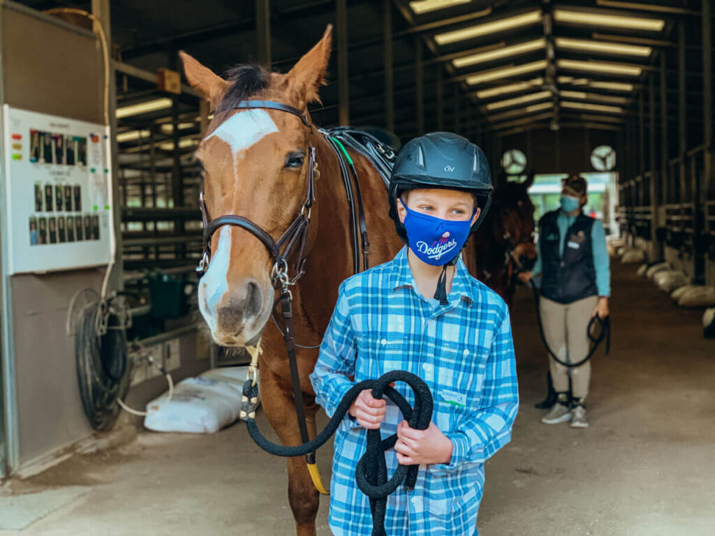 “Drew loves to tack up and lead his horse, because he feels in control.  He also enjoys trotting and riding on the trail.  Drew is very proud of his riding.”