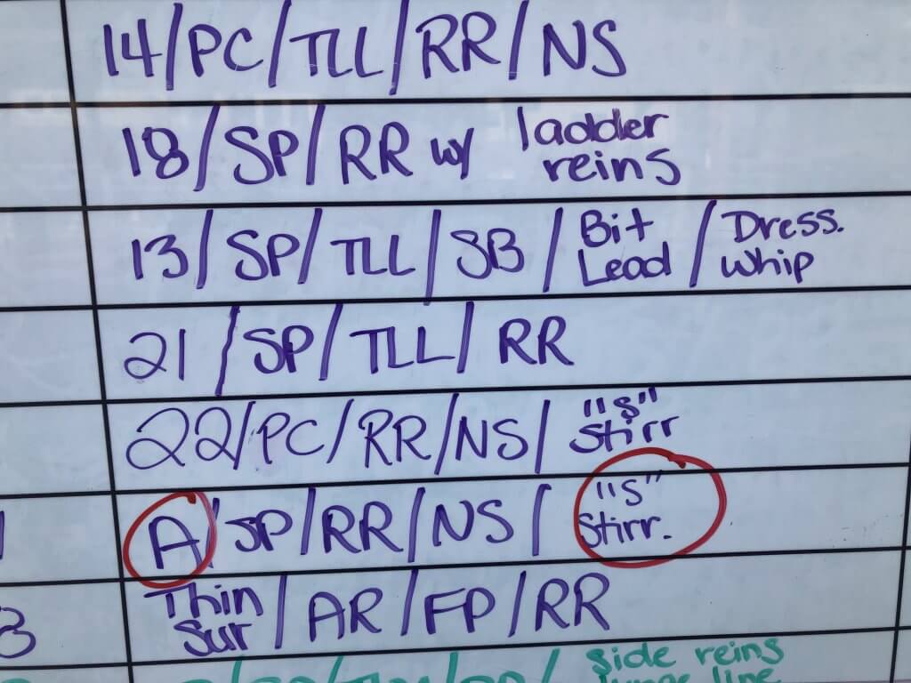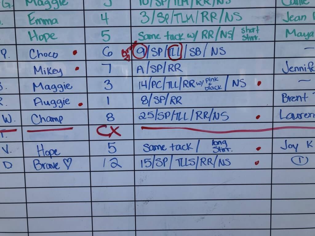 Ground zero for organizing all the activity is our white board. This is the starting point of communication in which chaos is turned into a finely tuned day of serving clients. Equipment abbreviations and acronyms abound. Crib sheets posted in the barn and tack rooms help new volunteers decipher the code.