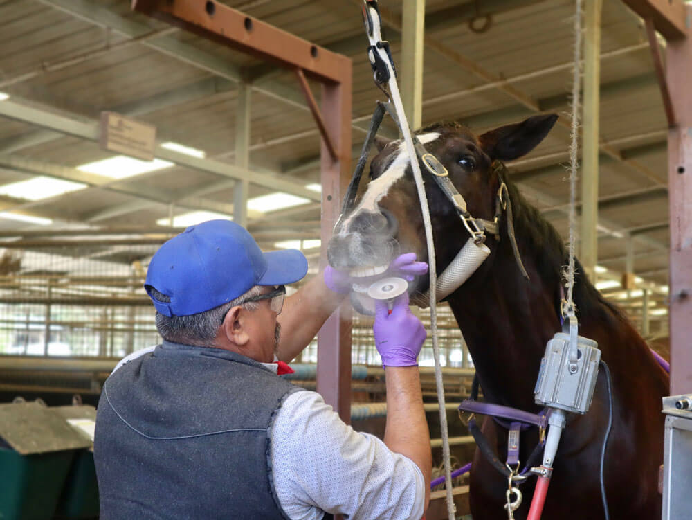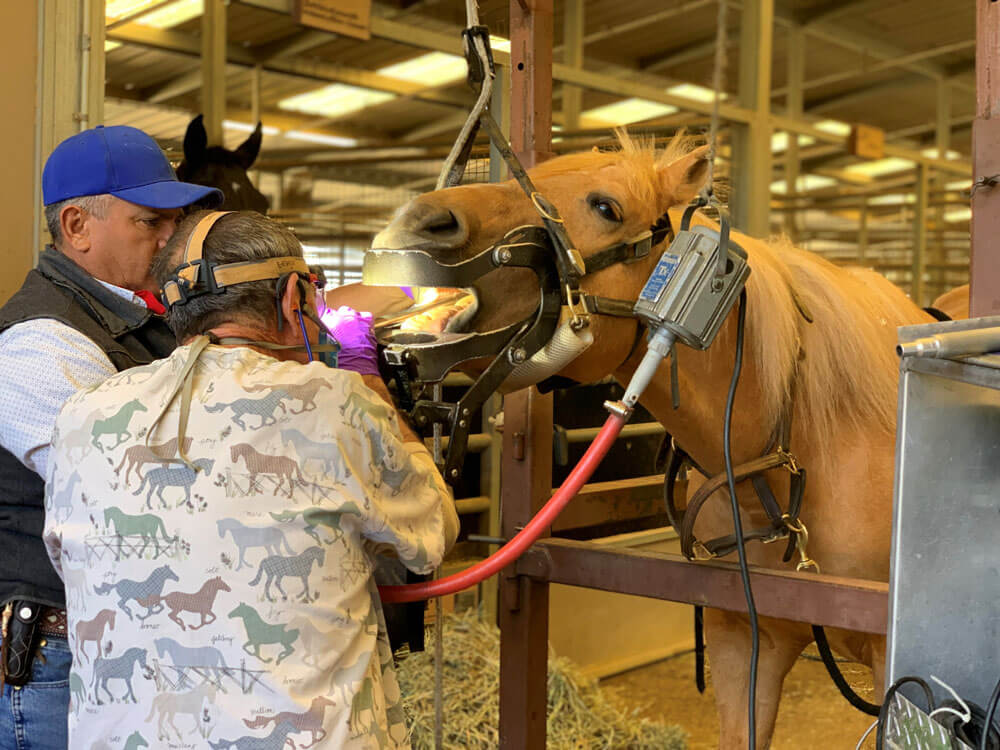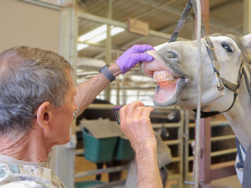 When examining and cleaning a horse’s teeth, the horse is placed in a mobile stock, lightly anesthetized, and a lightweight facial speculum is put in place to allow the mouth to remain open. The teeth are then floated, which means to contour them with a file called a “float.” The horse does not feel any discomfort during the procedure because its nerves end far from the gum line. Floating allows the horse to chew more effectively, perform more comfortably in the bridle, and stay healthier.