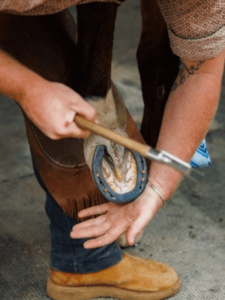 Horseshoes are necessary for horses that experience rapid or uneven hoof wear. Shoes provide the extra support and protection needed. Conversely, horses with naturally strong, healthy hooves that wear down evenly may not require shoes and are referred to as “barefoot.” Even barefoot horses still receive regular hoof trims from the farrier, and we apply hoof conditioner twice daily to prevent cracks, dryness, and other hoof damage.