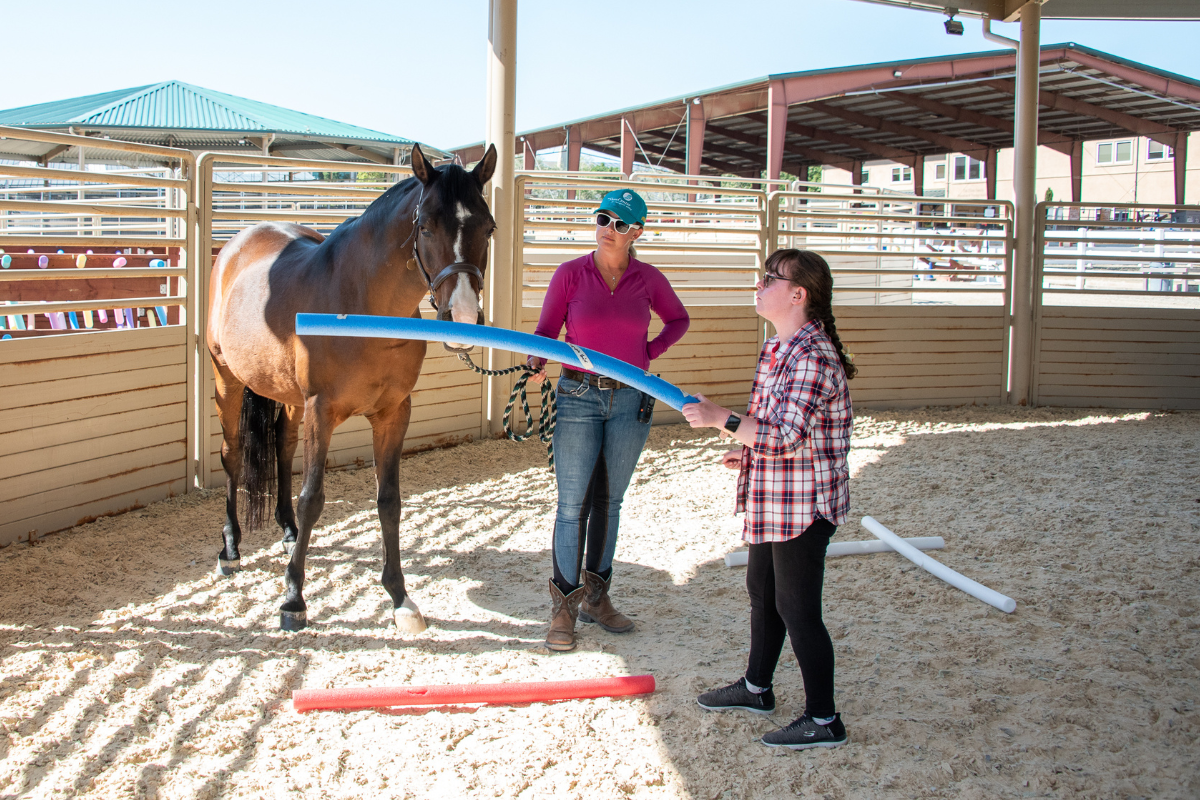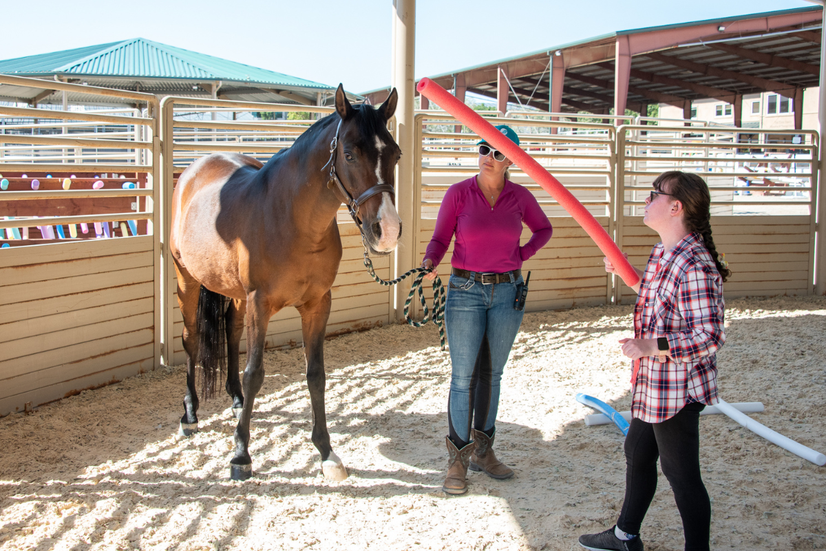 Megan works with Auggie, a well-loved horse who happens to be uneasy around pool noodles, which are used by therapists and adaptive riding instructors in session activities. This shared sensitivity has created a unique opportunity for Megan and Auggie to support each other in overcoming their fears. “My goals are helping Auggie to be brave and for me to be brave too,” Megan explains. “Sometimes when I’m at Shea, I feel nervous, but I want to work on my noise problems—and I want to help Auggie with his trauma sticks.” (“Trauma sticks” is Megan and Auggie’s nickname for pool noodles.)