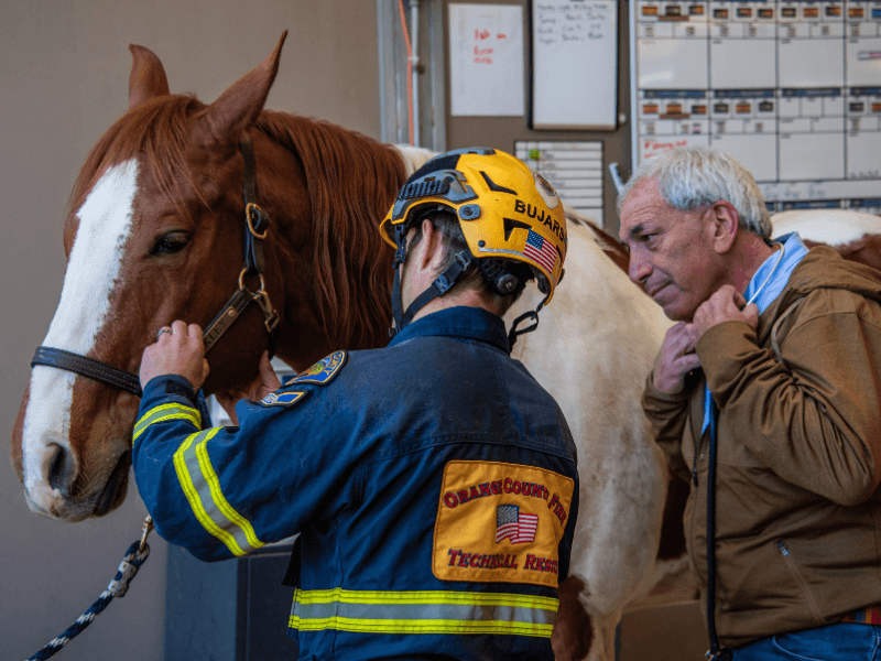 In 2021, OCFA rescued Choco, a Shea Center therapy horse who became trapped in San Juan Capistrano’s open space during a trail ride. OC fire officials used a helicopter to airlift Choco to safety after digging him out from under concrete and exposed rebar in an extraordinary and highly technical horse rescue.
