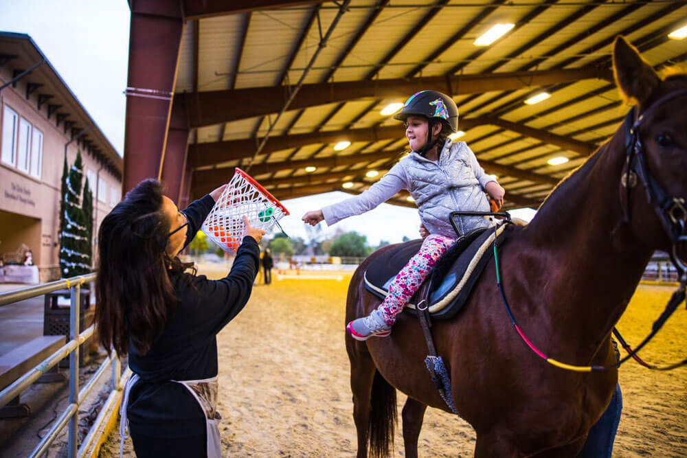 The movement from the horse stimulates our sensory and motor systems that activate the muscles needed for balance and postural control. When these muscles become stronger, we are able to stabilize our body so we can complete finer tasks such as buttoning a shirt, brushing our teeth, or holding a pencil. Play is the work of children. Incorporating fun games while on the horse engages gross motor, fine motor, visual motor, executive functioning skills, and sensory processing as well as building therapeutic rapport between client, therapist, and horse. The barn environment can also be a fun world to explore whether it is looking for birds out on the trail, climbing hay bales, or making horse treats.