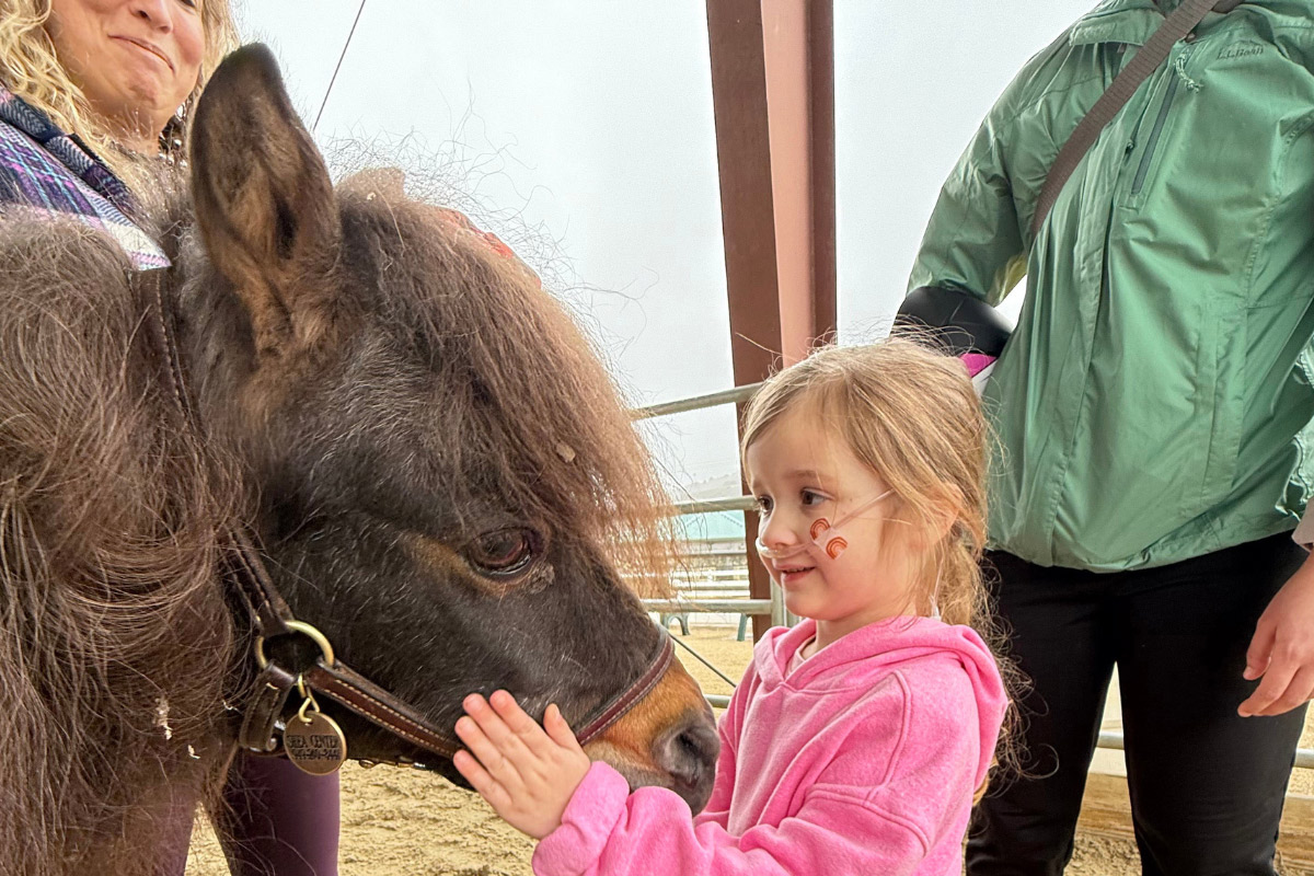 Recently, she proudly stood on Boog’s back during a physical therapy session utilizing hippotherapy. Her physical therapist, Caitlin Wands, shares, “Amelia is making progress in all areas. In particular, she’s improving her endurance and strength, maintaining different positions on her horse, Boog, and building the cardiovascular stamina to take our mini horse, Mac n Cheese, or our facility dog, Tex, for a walk at the end of her session. She’s also gaining confidence in navigating uneven terrain and new environments.”