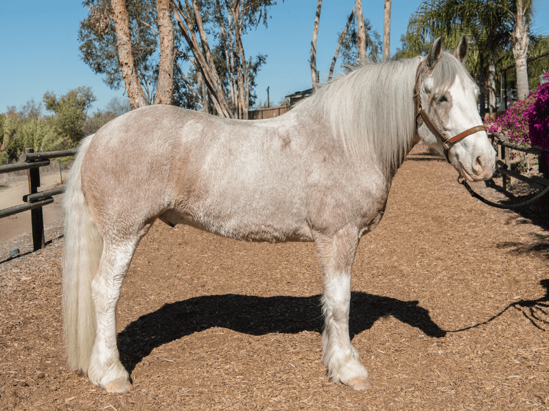 Huckleberry needs a partial sponsorship. Huckleberry is a 10-year-old Gypsy Draft Cross who came from a ranch in Canada. His unique coloring is called Strawberry Roan, which is a mix of white and red hairs. His height, stature, and temperament make him perfect for the Military Program riders. He has a wide base of support; some say he is like “sitting on a couch,” which is great for balance during vaulting. When Huckleberry is not in client lessons, he enjoys socializing with other herd members in the turn-out pens. Looking closely at his face, you can see that he has a mustache.