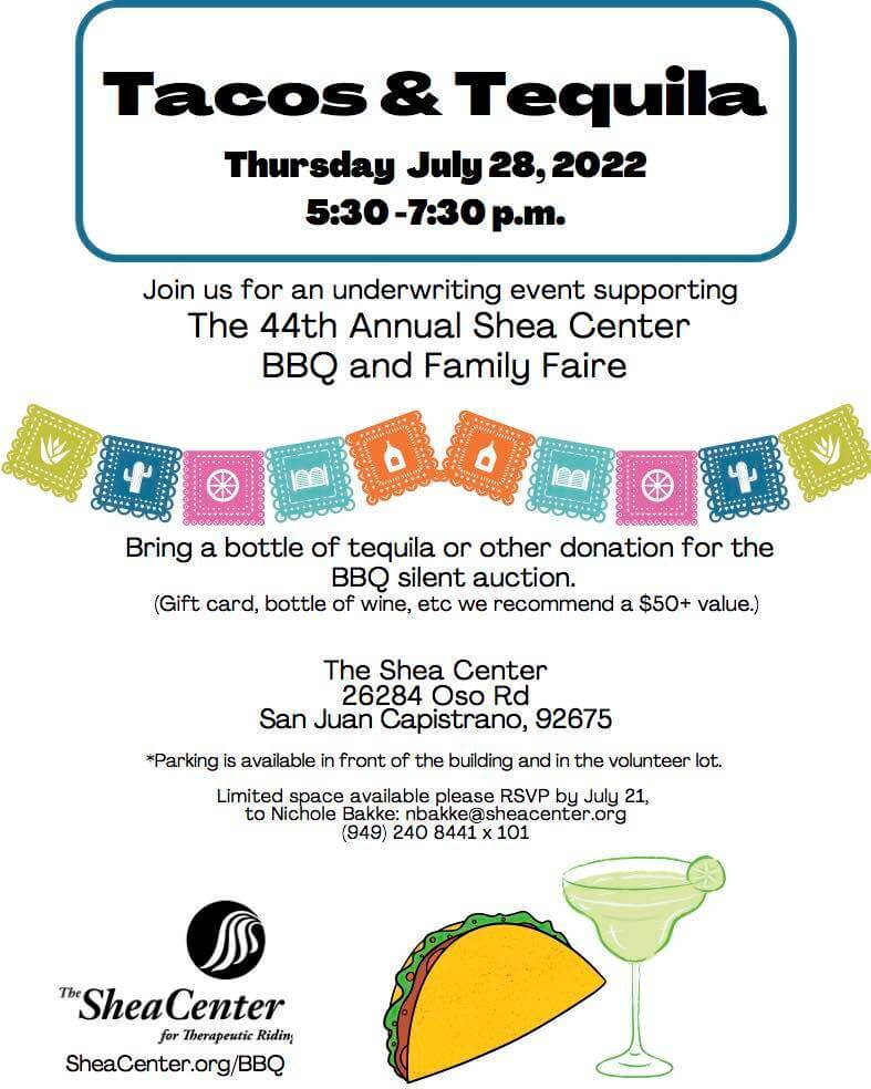 You are invited to Tacos and Tequila, an underwriting event for our 44th Annual BBQ and Family Faire fundraiser!