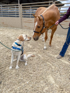 Tex doesn’t ride horses himself, but he knows his horse buddies’ roles and supports clients in his own special way. He has joined award ceremonies, handing out ribbons, and often sidewalks alongside the horses. While clients are mounted, Tex usually relaxes nearby, saving his interactions for before and after horseback activities.