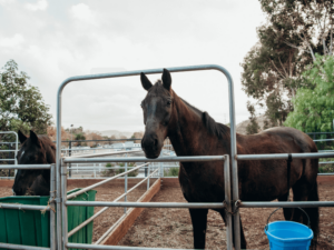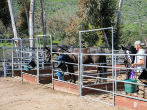 Seven sun pens are scattered across the property. They are designed to allow horses to interact, groom one another, sunbathe, and roll freely outside their stalls. Each pen has a hay bag and water bucket where the horses can slowly graze and stay hydrated while they relax.