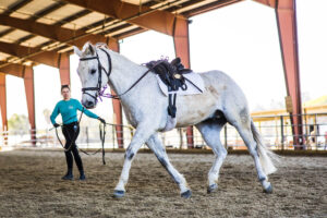 Every horse in the program walks, trots, and canters. With each horse involved in diverse training, staff help strengthen their toplines and maintain their balance and suppleness for our client lessons. Having therapists and instructors actively involved in horse exercise allows them to work hands-on with the horses they use in client lessons.