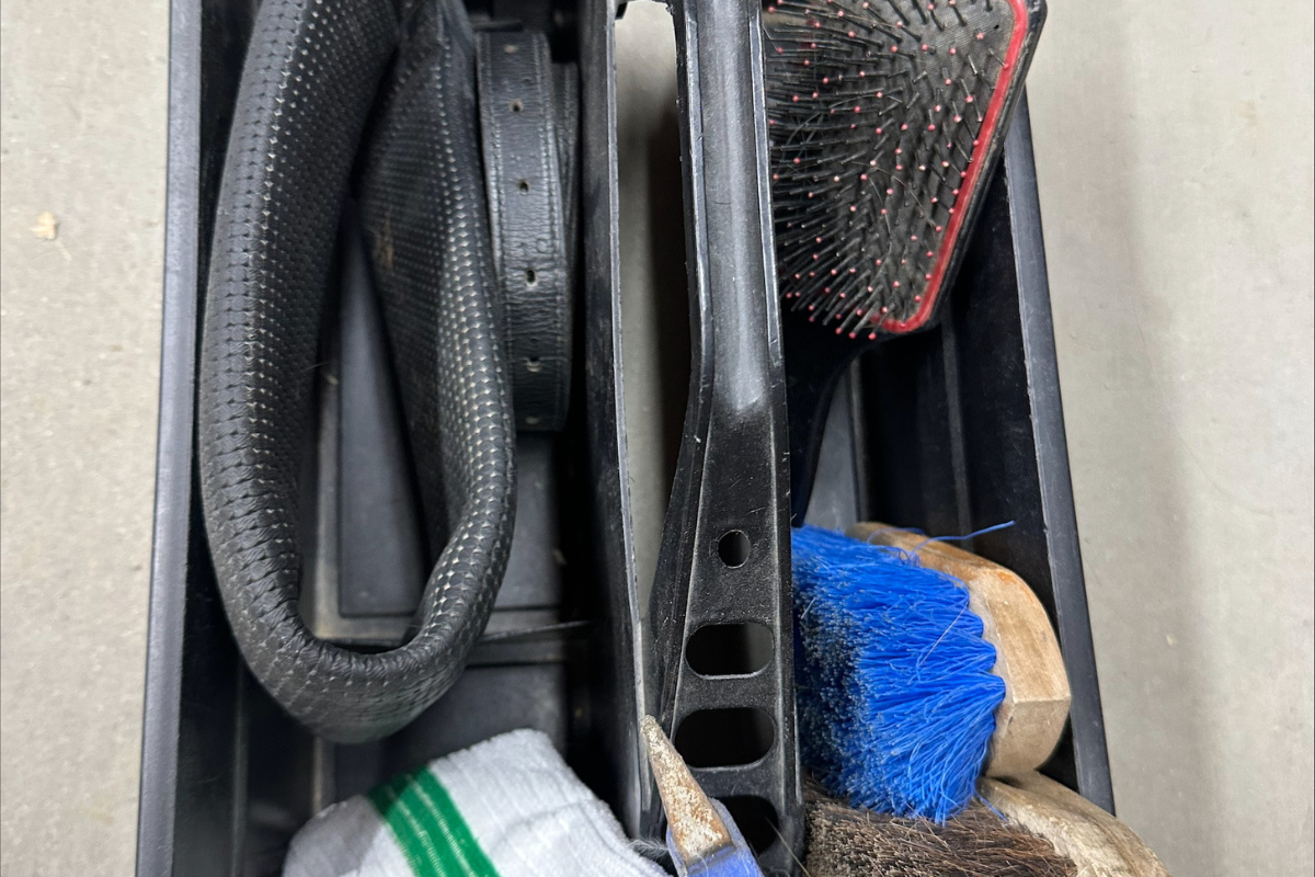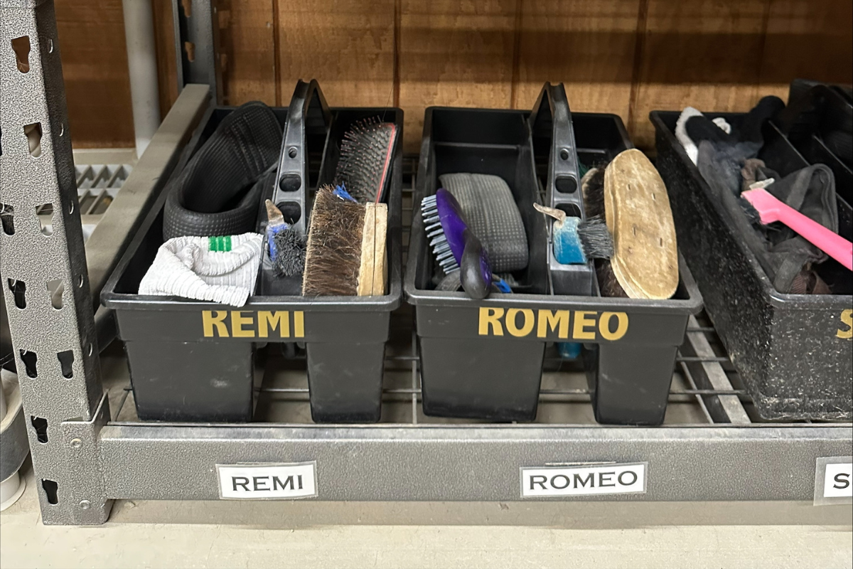 Every horse at The Shea Center has its own grooming bucket with its name on it. This helps to keep specific items for specific horses organized and easy to find. In every grooming bucket, you will find a stiff bristle brush, a soft bristle brush, a mane and tail brush, a hoof pick, and an all-purpose cloth. Also in each grooming bucket is a dressage girth and neck strap with the horse’s name on it. There may be some other items specific to an individual horse (boots, bonnet, etc.).